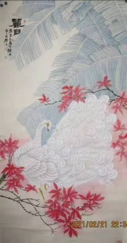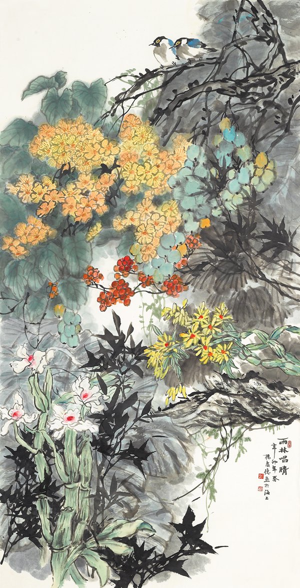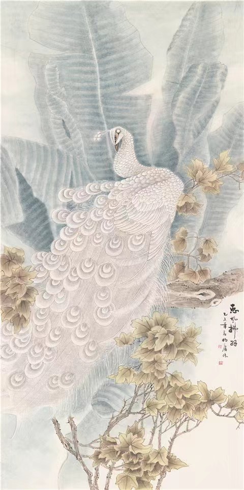 這些作品的特點是畫面非常和諧統(tǒng)一,形式構(gòu)成十分考究,造型優(yōu)美。這些優(yōu)美不同于甜美和俗美。這些審美意境給人一種靜靜的安適感,透出一縷清香之氣。“融合中西”是作者一直潛心研究的課題,借鑒西方藝術(shù),講究用色,在隨類賦彩中著力于調(diào)子的營造,使作品色彩感強但不浮躁,構(gòu)圖也別于一般花鳥畫,同時運用傳統(tǒng)的線條,輕盈勁健,使花鳥畫更富有現(xiàn)代情趣。創(chuàng)造畫面肌理美是作者又一特色。肌理是一種繪畫語言,能起到點、線、面無法替代的作用。利用各種材料、工具、手法創(chuàng)造出來多種不同肌理必然會使畫面產(chǎn)生不同的意境。