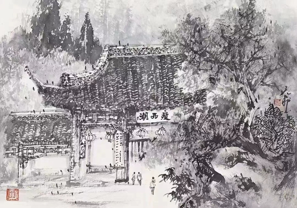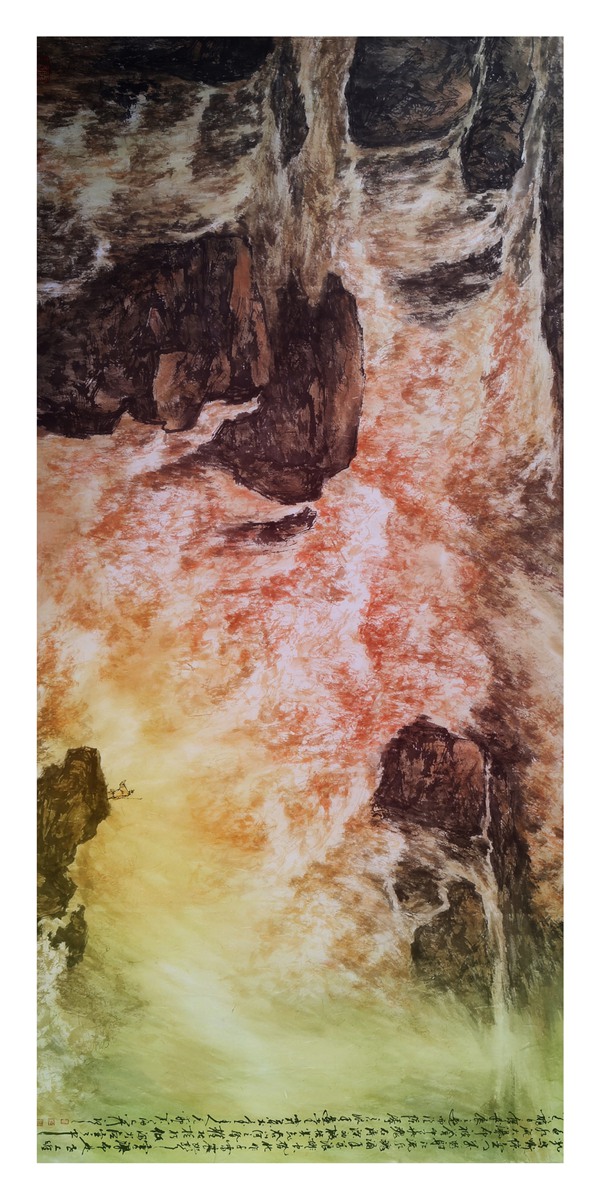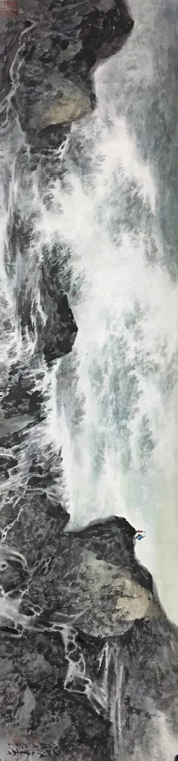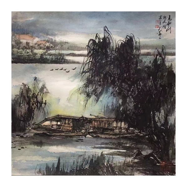 李元?jiǎng)椎漠嬑掖蠖鄶?shù)都很欣賞。我感到他畫得很縱恣,筆墨上放得很開,無論是山水系列,還是屋語系列,畫面上水和墨的洇滲效果,非常自然,給人感覺是天然的一樣,你可想到他作畫時(shí)候,毛筆散鋒都已經(jīng)散到那種程度了,他也不可以去調(diào)整,可以說已達(dá)到了中國畫中用筆自如的境界了。
