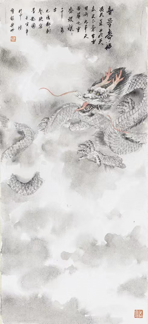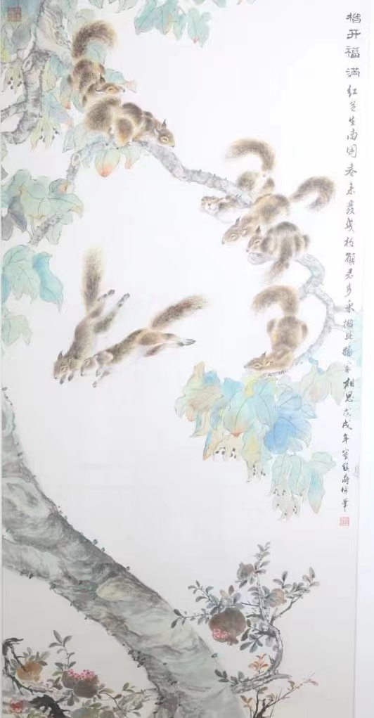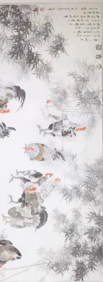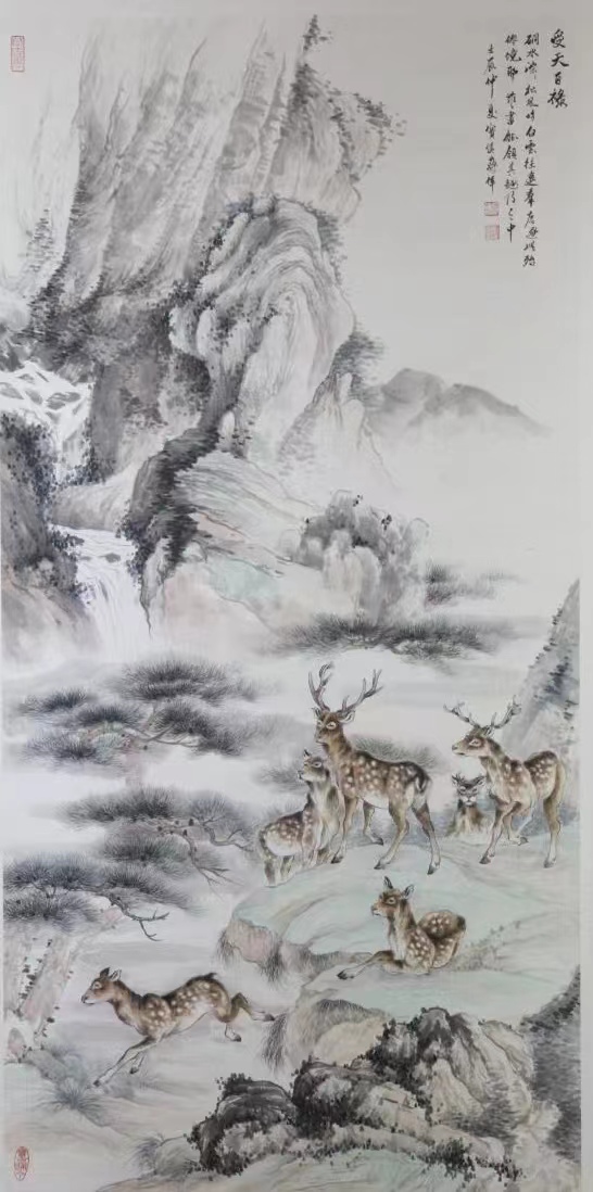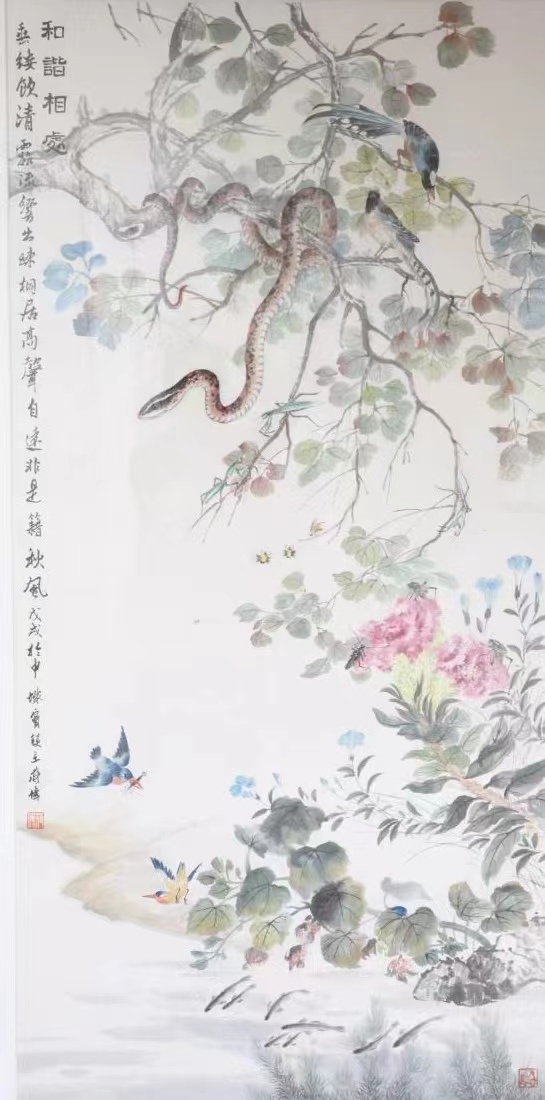 我注意到,蔣偉的十二生肖長(zhǎng)中,每種動(dòng)物背后都配有豐富的對(duì)應(yīng)背景。畫(huà)什么動(dòng)物要搭配什么背景,這在中國(guó)傳統(tǒng)繪畫(huà)中是有嚴(yán)格講究的,不能亂搭配,比如猛虎往往出沒(méi)于山林,這就不但要求畫(huà)家會(huì)畫(huà)虎,還必須有一定的山水畫(huà)基礎(chǔ)。動(dòng)物是人類(lèi)的朋友,亦是科學(xué)藝術(shù)的靈感源來(lái)。中國(guó)文化深受中國(guó)古典哲學(xué)的影響,古人把十二生肖分為六組,兩兩相對(duì),集中起來(lái)歸于一點(diǎn),就是每一對(duì)組合都是相互依賴(lài)、相互補(bǔ)充、相互滲透、相互完善的,用儒家思想解釋?zhuān)褪恰熬雍投煌保@也正是儒家所倡導(dǎo)的人與人的相處之道。中國(guó)古代哲學(xué)很早就孕育出了“一張一馳”“對(duì)立統(tǒng)一”“陰陽(yáng)互補(bǔ)”的辯證法思想,這也是我們中國(guó)文化之所以能夠源遠(yuǎn)流長(zhǎng)幾千年的緣故。將偉在他的畫(huà)中,將動(dòng)物與山水、花鳥(niǎo)、草木集中展現(xiàn)在一起,并還原了動(dòng)物與自然的關(guān)系,讓人感到生命與自然的可愛(ài)和寶貴。他用畫(huà)筆構(gòu)建了一個(gè)和諧世界,世外桃源,從而表達(dá)出他對(duì)生態(tài)平衡意識(shí)的思考,強(qiáng)調(diào)了各類(lèi)生命之間相互扶持的重要性,顯示出辯證看待問(wèn)題的思維模式,這是很不容易的。一幅十二生肖長(zhǎng)卷對(duì)畫(huà)家繪畫(huà)功底的全面性和面外綜合文化修養(yǎng)提出了很高的要求和挑戰(zhàn)。