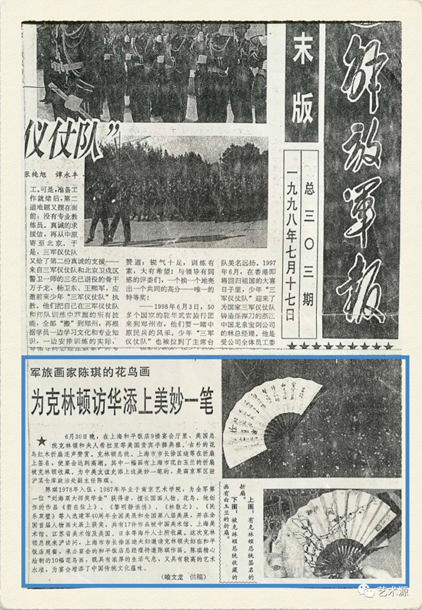 1998年,陳琪老師在上海和平飯店創作國禮扇面,時任上海市長徐匡迪與美國總統克林頓分別在扇面背面簽名互贈,其中象征上海市花《白玉蘭》折扇圖,由時任美國總統克林頓收藏。
