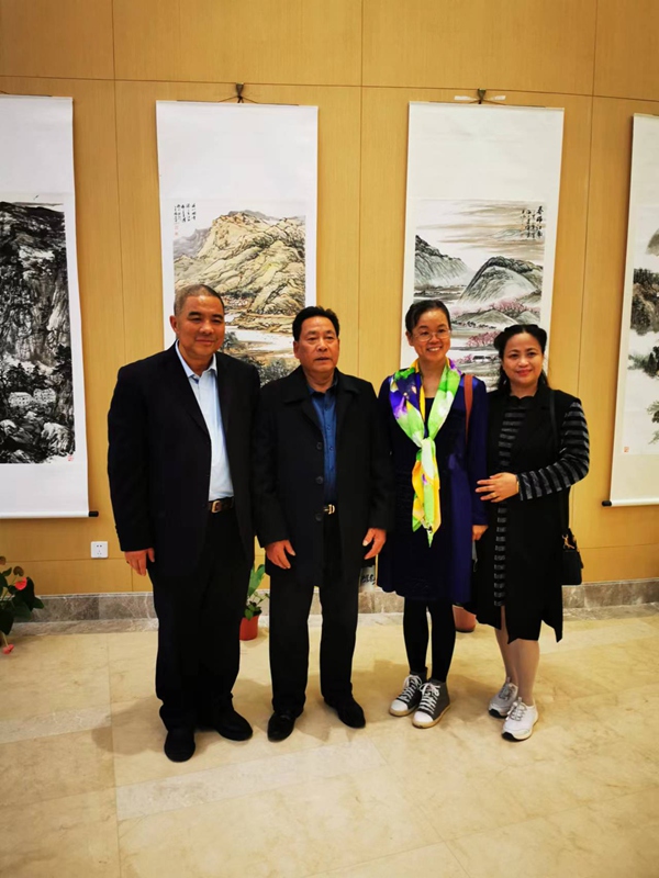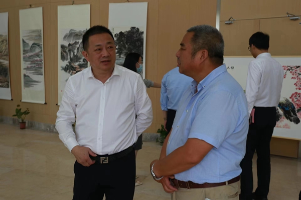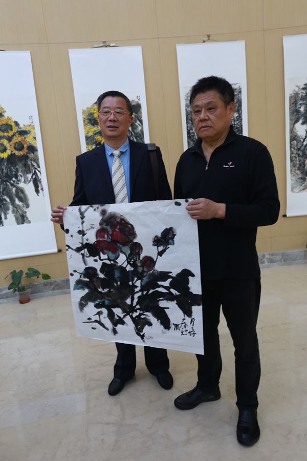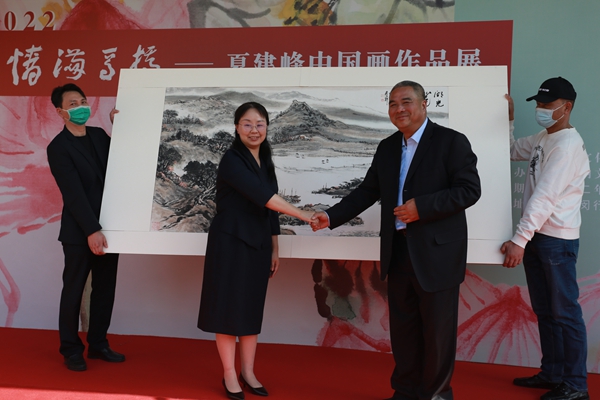 在開幕式上,夏建峰老師一幅六尺整張的山水畫,捐贈給馬橋鎮人民政府,馬橋鎮副鎮長吳慧女士代表馬橋,接受了這幅作品。