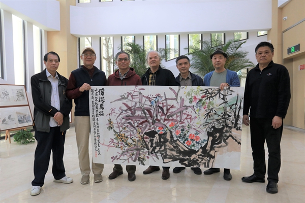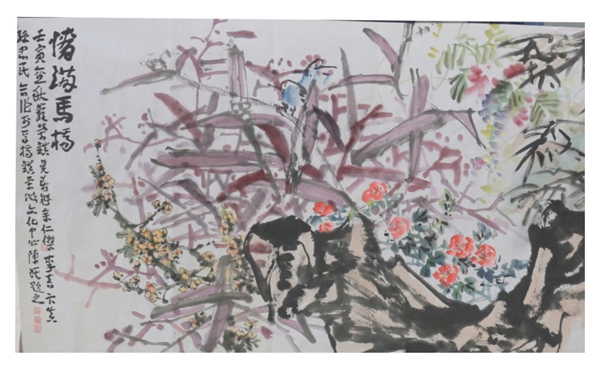 陳琪、余仁杰、嚴榮鎮、孫忠民、卞真、李言和吳春魁合作六尺整張的花鳥畫作品,陳琪老師題寫來畫名“情滿馬橋”