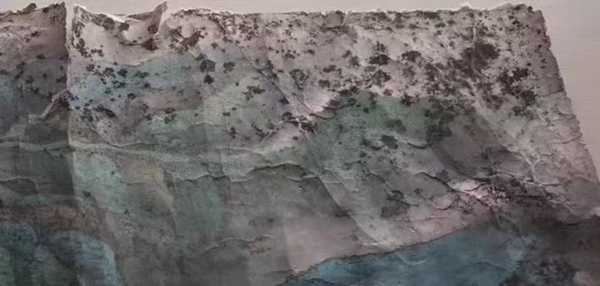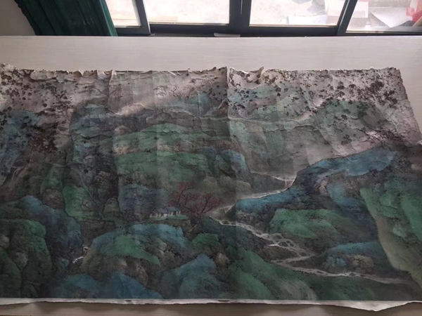 偌大的一幅大青綠山水因保管不善而受潮霉蝕的極其嚴重已不成其畫。展開畫面一股刺鼻的霉味撲面而來,令人窒息,樂老師精心創作的精品山水已被霉菌啃嚙得面目全非,看到如此情景,我們被嚇得一跳,我們的心情很難過,也近乎窒息。但刻不容緩,接著我們便開始了清洗修復的工作。(上圖)