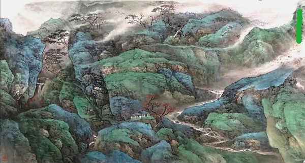 樂老師的此幅是大青綠山水,圖片上可見的水墨勾、皴、擦、點是我所補畫的。(上圖)