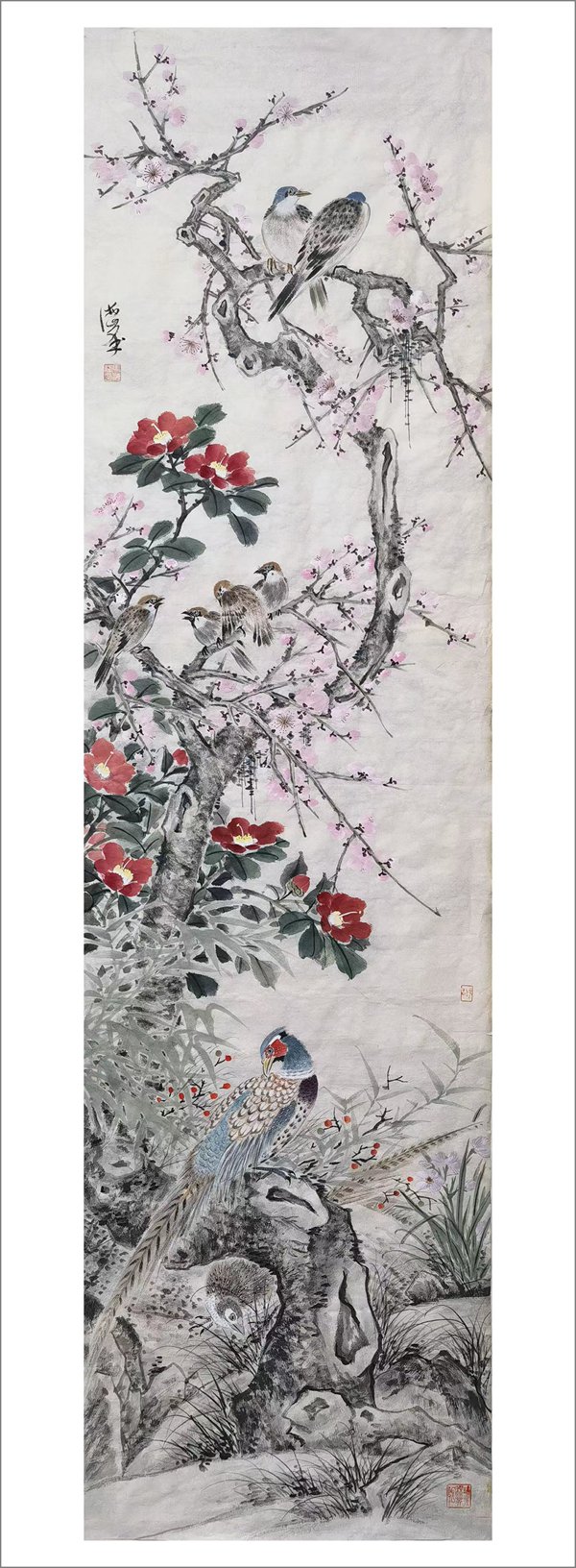 馬海峰以擅畫花鳥著稱。20年前,馬海峰參加上海和杭州國際藝術博覽會,創造了作品當天售罄的業績,但他立志成為有創新精神的藝術家。他把“老百姓喜歡、專家點頭、藏家歡迎”作為自己畢生的追求。這些年來,他將心中大美寄情于筆端,探索花鳥畫化古開今、高昂與柔情相結合的道路,攀登他向往的藝術高峰——旭日推窗,眼前是百花齊放燦爛無比的詩意世界。馬海峰做到了,別具一格的花鳥畫為世人矚目,作品多次入選全國美術大展并獲獎,為省級美術館和中國革命軍事博物館收藏。