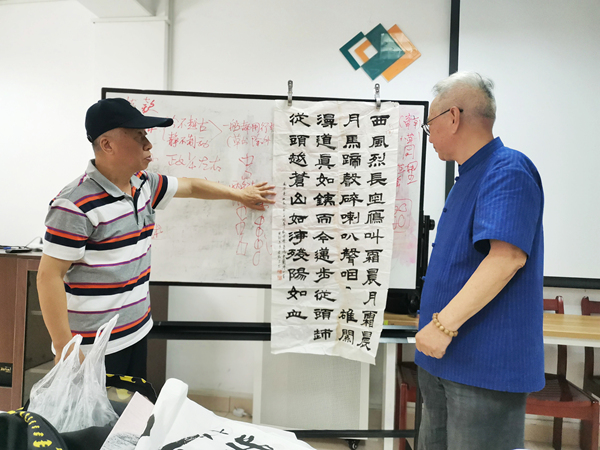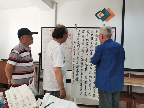 來的最早的要數(shù)聯(lián)誼會的書法愛好者王立老師,每次活動,他都要提前到,來做一些準(zhǔn)備工作,這次也是這樣,可以早點(diǎn)開空調(diào),可以讓后面的人來了以后,可以享受清涼世界,他是一位活動的熱心人,一忽兒,教室在兩臺空調(diào)的降溫下,出現(xiàn)了一絲絲的涼意,一點(diǎn)半還沒有到,王宜明老師也提前來了,大家圍著王老師,迫不及待的就拿著作品請王老師點(diǎn)評。
