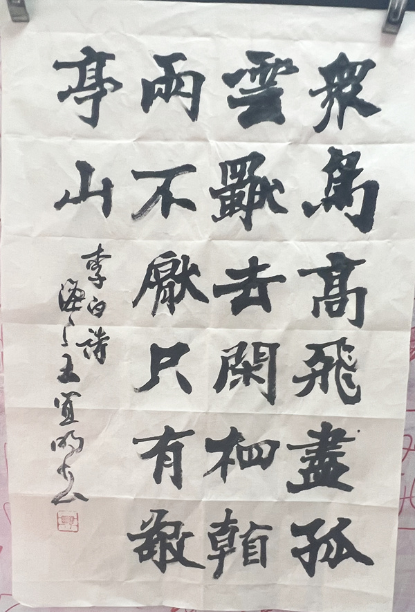 講座開始,王老師笑呵呵的,開始了一系列的精彩絕倫的演講,他把書法的原理,發(fā)展,以最通俗表達(dá),用風(fēng)趣幽默的語言,讓大家聽的明白,他深入淺出的告訴大家,怎么臨摹字帖,以及在書法創(chuàng)作中所注意的許多問題,會員們認(rèn)真的記著筆記,有些會員拍著視頻,怕遺漏了精彩內(nèi)容,一個個聚精會神的,由于時間關(guān)系,講座進(jìn)入到下一個議程,點(diǎn)評作品,這個時候,大家拿出自己平時臨摹和創(chuàng)作的書法作品,王老師對每一幅作品都認(rèn)真的進(jìn)行了點(diǎn)評,把活動也推向了高潮,最后夏會長鋪好了宣紙,請王老師現(xiàn)場示范,王老師氣足神韻的為大家現(xiàn)場寫了一幅楷書作品。