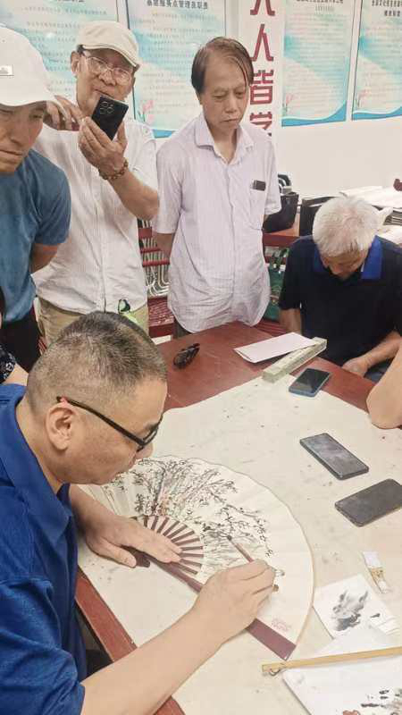 八月的天氣,上海市區的街道上,像火爐烤的一樣,非常的炎熱,知青書畫聯誼會的會員們,冒著酷暑來到位于天山社區文化活動中心教學樓創作基地,來參加活動。會長夏建峰早早的來到這里,還有副會長兼秘書長英自海,會員曹啟文、稻香、陳國珍、李建華、蔡建平、馬詠鳴、顧鞍鋼、胡敬興、薛梅娣,還有應邀參加活動的孫忠民、嚴榮鎮。