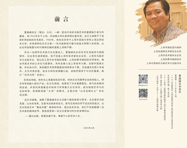 這次書畫展,凝聚了夏建峰先生從藝數十載的探索與思考。無論是花鳥的靈趣、山水的渾厚,還是書法線條的張力,皆可見其師古而不泥古的創造力,以及對海派藝術“兼容并蓄”精神的傳承。透過這些作品,我們不僅能觸摸一位藝術家的精神世界,更能感受到一位文化使者對時代的深情回應。