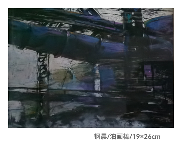 怎么辦,一次無意中翻到了一本1988年出版的德加藝術(shù)標(biāo)志一一粉筆畫,讀完這本書,我感到非常啟發(fā),它不僅拓展了我繪畫思路,還讓我學(xué)到了處理畫面的能力和方法。尤其是德加的一幅(舞臺上排練)對空間和光線的獨特運(yùn)用,筆觸輕松肯定,底色和顏色之間微妙 融合,真是巧妙絕倫,深受啟迪,這對我完成鋼晨油畫棒創(chuàng)作奠定了基礎(chǔ)。后來我是從一堆油畫棒廢紙中發(fā)現(xiàn)了一張可以畫下去的畫面,感覺有點像鋼廠的管道,忽然間茅塞頓開,我就順著這種感覺畫下去,把握了光和底色的巧妙關(guān)系一氣呵成,由于櫻花油畫棒質(zhì)地硬,很難畫細(xì)節(jié),我就利用刻刀刮出點線,效果出來了,我的第一幅油畫棒處女作(鋼晨)就這樣誕生了。