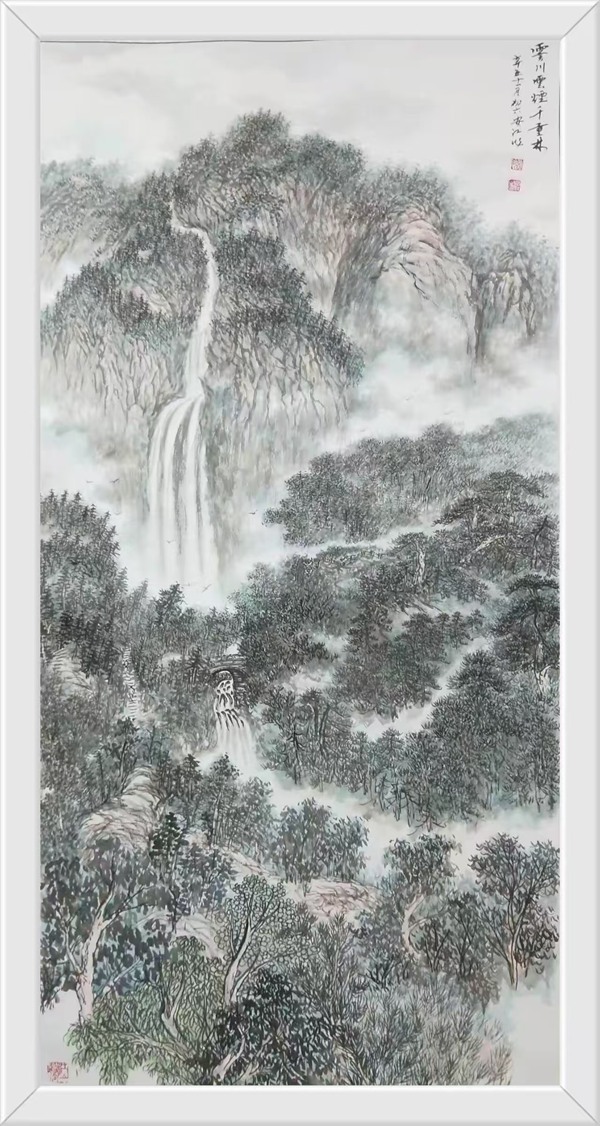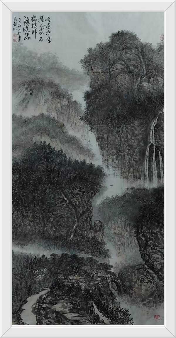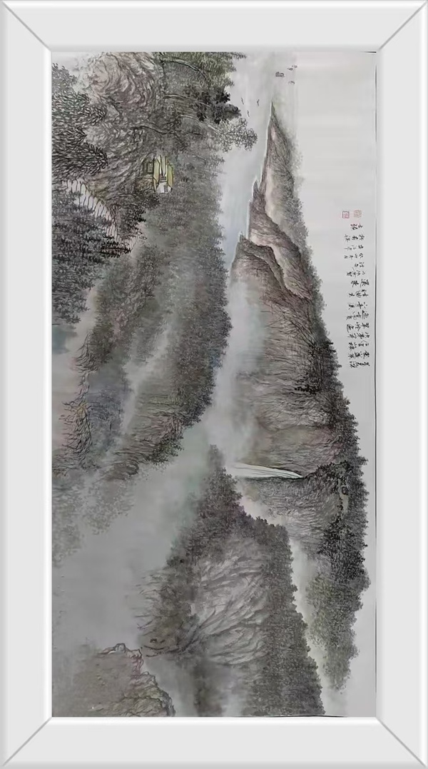 構圖如造園,需深諳「開合之道」與「虛實之妙」。經典的「品字形三疊法」恰似搭建水墨舞臺的黃金框架,通過山石的錯落形成「開」的空間張力,又以云霧、溪流實現「合」的氣韻貫通。留白之處暗藏玄機——蜿蜒的水流似S形舞動,峭壁的走勢若Z形延伸,這些無形的韻律構成畫面的呼吸節奏。更需領悟矛盾統一的哲學智慧:近景的重墨與遠景的淡彩形成視覺對話,密集的苔點與大面積留白達成疏密平衡,讓二維宣紙承載三維的空間詩意。