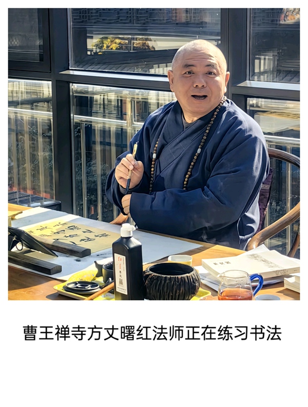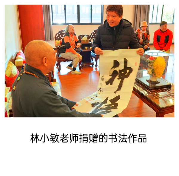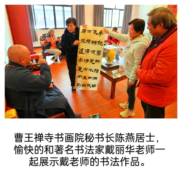 活動首站,眾人拜見了正在習書的曹王禪寺方丈曙紅法師。法師謙和地請大家先至客堂用茶,稍后即至。片刻之后,法師如約前來,與書畫院同仁暢敘交流。曙紅法師學識廣博、談吐從容,從佛法到藝術,由歷史至人生,無不娓娓道來。令人感佩的是,法師不僅深諳書法、精研筆墨,更將整座寺院治理得井然有序,于一殿一閣、一草一木間,皆可見其修為與匠心。
