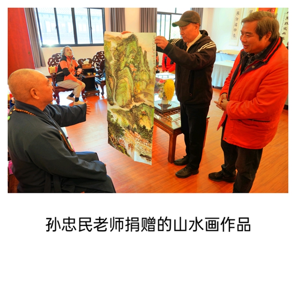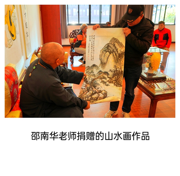 在隨后的交流環節中,夏建峰院長首先展示了準備捐贈給寺院的一幅四尺整張作品。其后,書畫院的藝術家們也紛紛呈現各自精心創作的代表之作。山水氣象萬千,花鳥生意盎然,人物形神兼備,書法筆走龍蛇——諸多佳作在古寺雅室中漸次展開,頓使滿堂增色。眾人圍繞作品切磋交流、互相啟發,藝術靈感在對話中不斷激蕩,現場洋溢著對傳統書畫藝術的誠摯熱愛與執著追求。