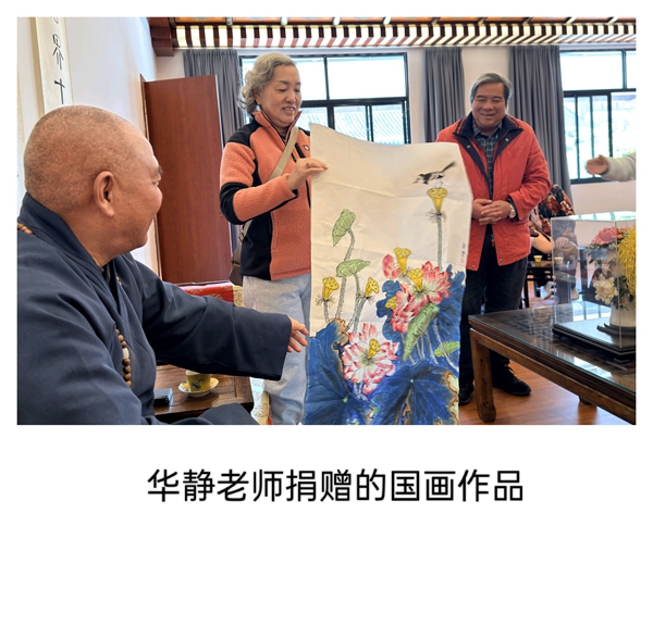 隨后,在陳燕秘書長的陪同下,藝術家們漫步參觀寺院園林。梵唄清音,爐香裊裊,古建與庭園相映成趣,大家在移步換景之間,靜心體味禪意空間的寧靜與深遠。晌午時分,寺院以素齋款待,眾人于飯香茶韻中繼續暢敘藝事、交流心得,情誼愈深。
