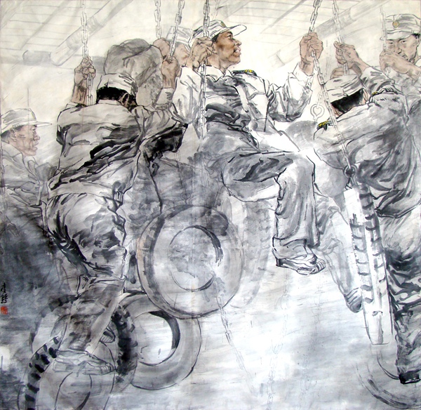 軍人的歷練當然也對李鐘作品的風格產生了影響。他喜歡下筆直取,畫面上沒有多少的機巧精術,用純粹的筆墨去直面軍營生活,透露出軍人的直爽剛正之氣。仿佛是受到了浙派前代大家吳山明先生筆墨風格的影響,李鐘把他的人物畫在墨色深度上降低了一個層次。當代寫實水墨人物畫的風格探索中有一個趨向,就是將沉著俊逸、反復疊加的筆法整合到人物體面——尤其是人物衣紋明暗起伏轉折的表達之中。這種藝術表達手段對提升畫面人物的視覺沖擊力有極大幫助;但如果掌握不好,會讓畫面顯得靈氣不足而生硬折滯。李鐘降低墨色帶來的柔和朦朧感,比較好地緩和了用筆墨在追求明暗凹凸關系上所帶來的凌厲感與生硬感,意境顯得更加婉約,畫面更加具有水墨韻味。