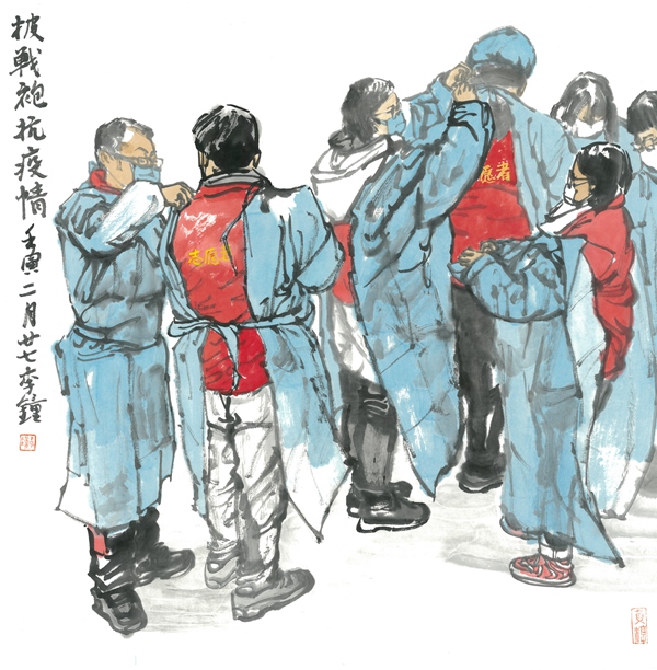 李鐘《披戰袍抗疫情》中國畫 69×69cm 2022