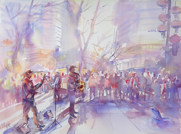 街頭藝人  54×77cm  水彩
