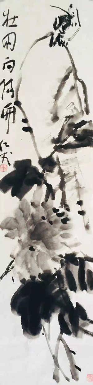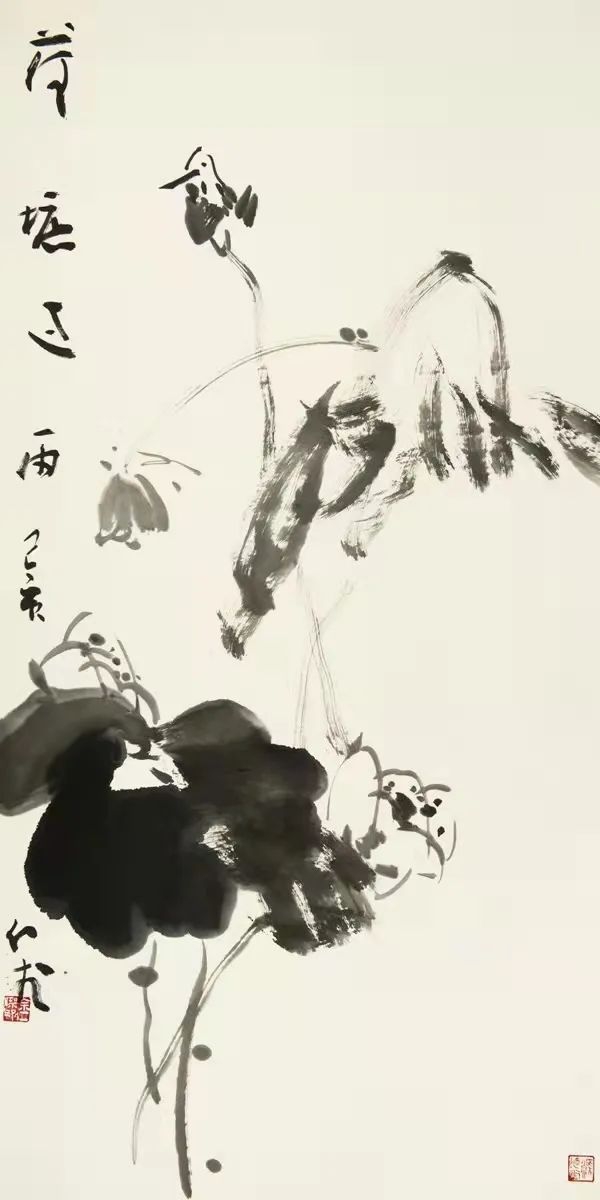 細(xì)數(shù)近代畫(huà)荷名家,張大千追求荷韻,清新優(yōu)美、揮灑如意;齊白石追求荷趣,天真爛漫、不似而似;潘天壽追求荷骨,霸悍頑強(qiáng)、崢嶸不屈;于非闇追求荷色,形象逼肖、妍麗精巧。余仁杰畫(huà)荷似乎有意避開(kāi)諸上名家,而獨(dú)取元明之空靈悠遠(yuǎn),徐渭、朱耷的影響尤為深刻。用盧金德的話(huà)來(lái)說(shuō),就是“余仁杰的中國(guó)畫(huà)在大寫(xiě)的酣暢中很使畫(huà)面有一種蔚霞的張力”。