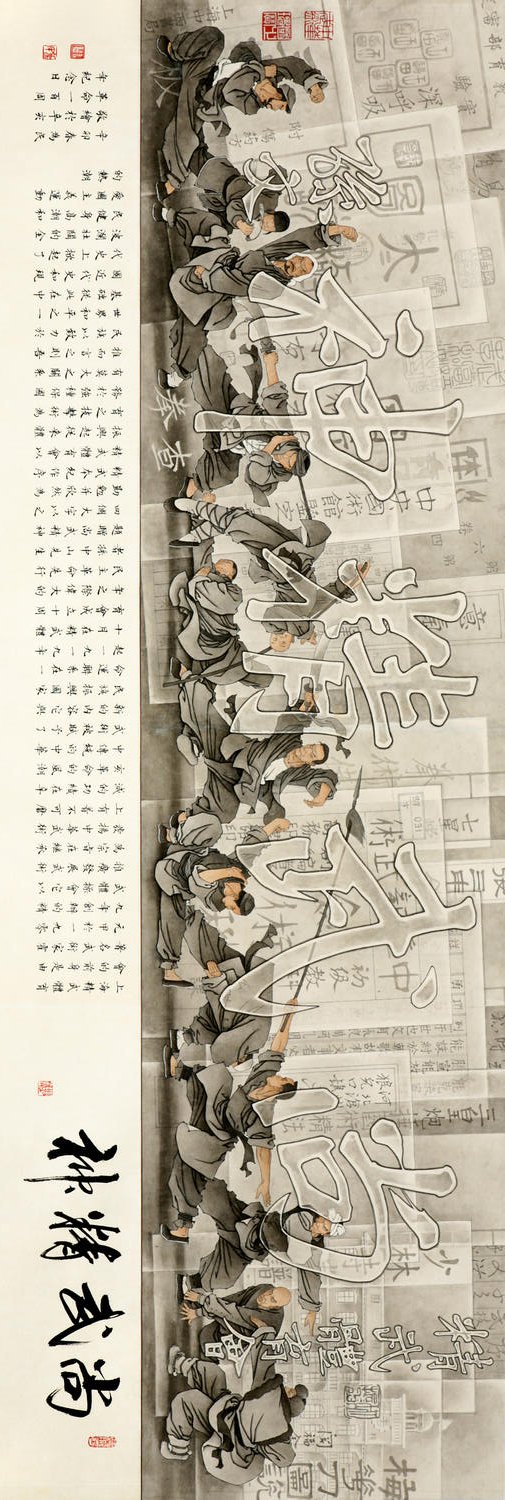初稿完成后,他又去上海體育學院武術系,請專家們評頭論足提修改意見。而體院武術系郭志禹教授被劉為民的誠意打動,又邀請了中國武術協會秘書長康戈武及當代武術泰斗蔡龍云先生等一起觀摩。《中華百拳圖》長25米高0.4米,一百個各朝代的武者組成一個高低起伏、錯落有致的群像,形象地展示了中華武術中重要的一百個拳術流派。此卷一經完成,得到行家的高度認可。馮驥才先生也欣然為之題書。請馮先生題字的原因,劉為民說:“馮驥才是小說《義和拳》《神鞭》《鷹爪拳》的作者,是一位懂武術的作家、畫家。”