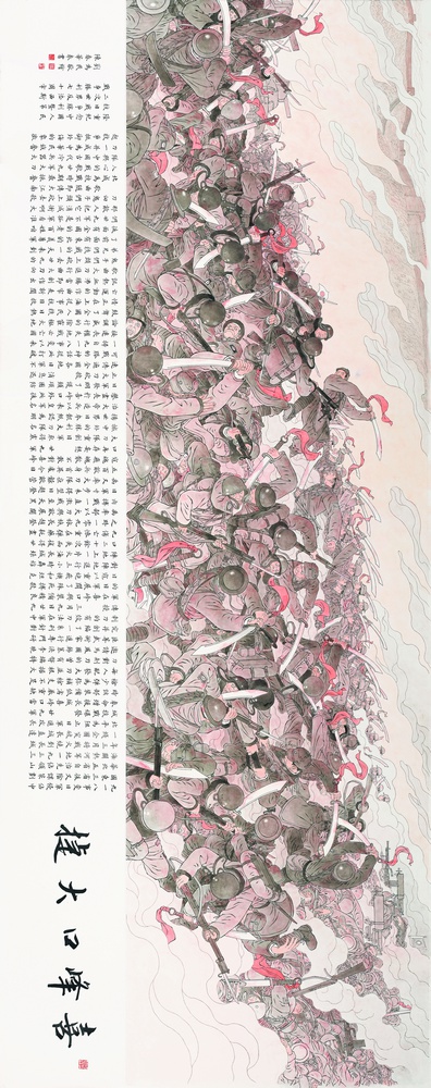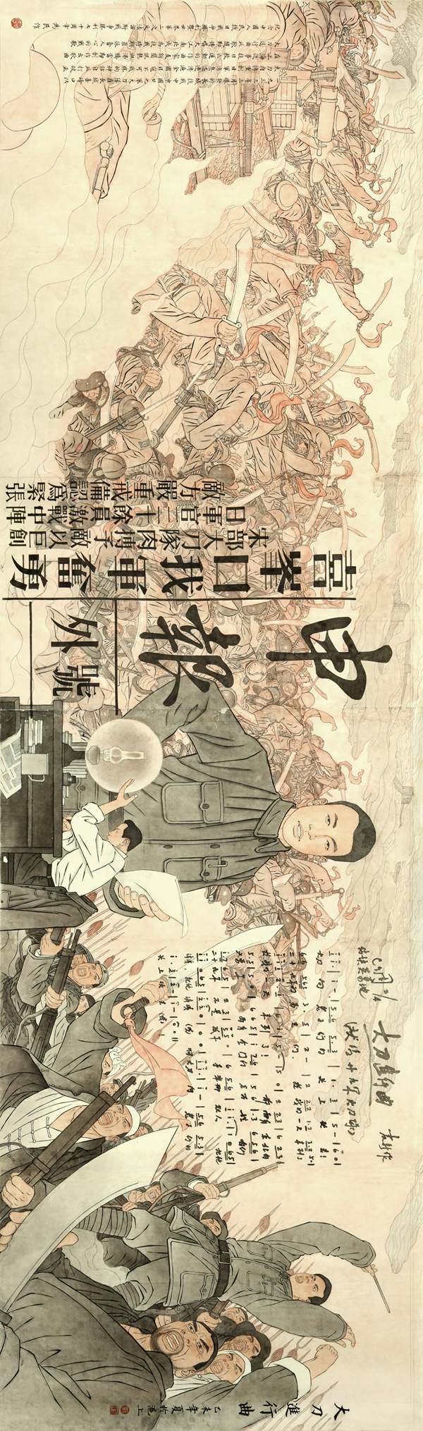 第一次讀到劉為民的作品,是在2015年上海圖書館舉辦的“紀念抗戰勝利70周年美術作品展”上。一幅長3.6米高0.9米的《喜峰口大捷》,描繪了抗戰時期“二十九軍大刀隊”在喜峰口與日寇搏殺的慘烈場面,人物眾多,完全把我帶入那沖鋒陷陣的硝煙之中,極富張力。我想那復雜對抗的動態描繪,如果沒有部隊生活體驗和扎實的造型能力,是不可能完成的,讀后一直在我的腦海揮之不去。于是,有一天我向海派連環畫、中國畫大家汪老(汪觀清)打聽《喜峰口大捷》的作者。汪老說:“這是一個喜歡武術,練武術又畫武術的畫家,畫得很內行,表現的武術動作功架看上去很真實。”