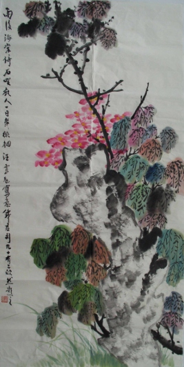 2.**構(gòu)圖的空間重構(gòu)**:受陸儼少山水畫(huà)影響,他常以“之”字形布局打破傳統(tǒng)折枝構(gòu)圖,通過(guò)山石、云氣與牡丹的組合,構(gòu)建具有縱深感的畫(huà)面空間。這種處理方式使牡丹脫離單純的靜物屬性,成為自然生態(tài)的有機(jī)組成部分。