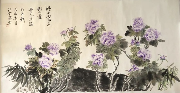 汪云飛的牡丹藝術(shù)以其深厚的傳統(tǒng)底蘊(yùn)與創(chuàng)新性的技法融合,成為中國(guó)當(dāng)代花鳥(niǎo)畫(huà)中獨(dú)樹(shù)一幟的存在。其創(chuàng)作不僅繼承了文人畫(huà)的筆墨精神,更通過(guò)西畫(huà)技法的融入和對(duì)牡丹生態(tài)的長(zhǎng)期觀察,形成了渾厚豪放、空靈雋雅的藝術(shù)風(fēng)格。以下從藝術(shù)淵源、創(chuàng)作理念、技法特點(diǎn)及文化意涵四個(gè)維度展開(kāi)解析。