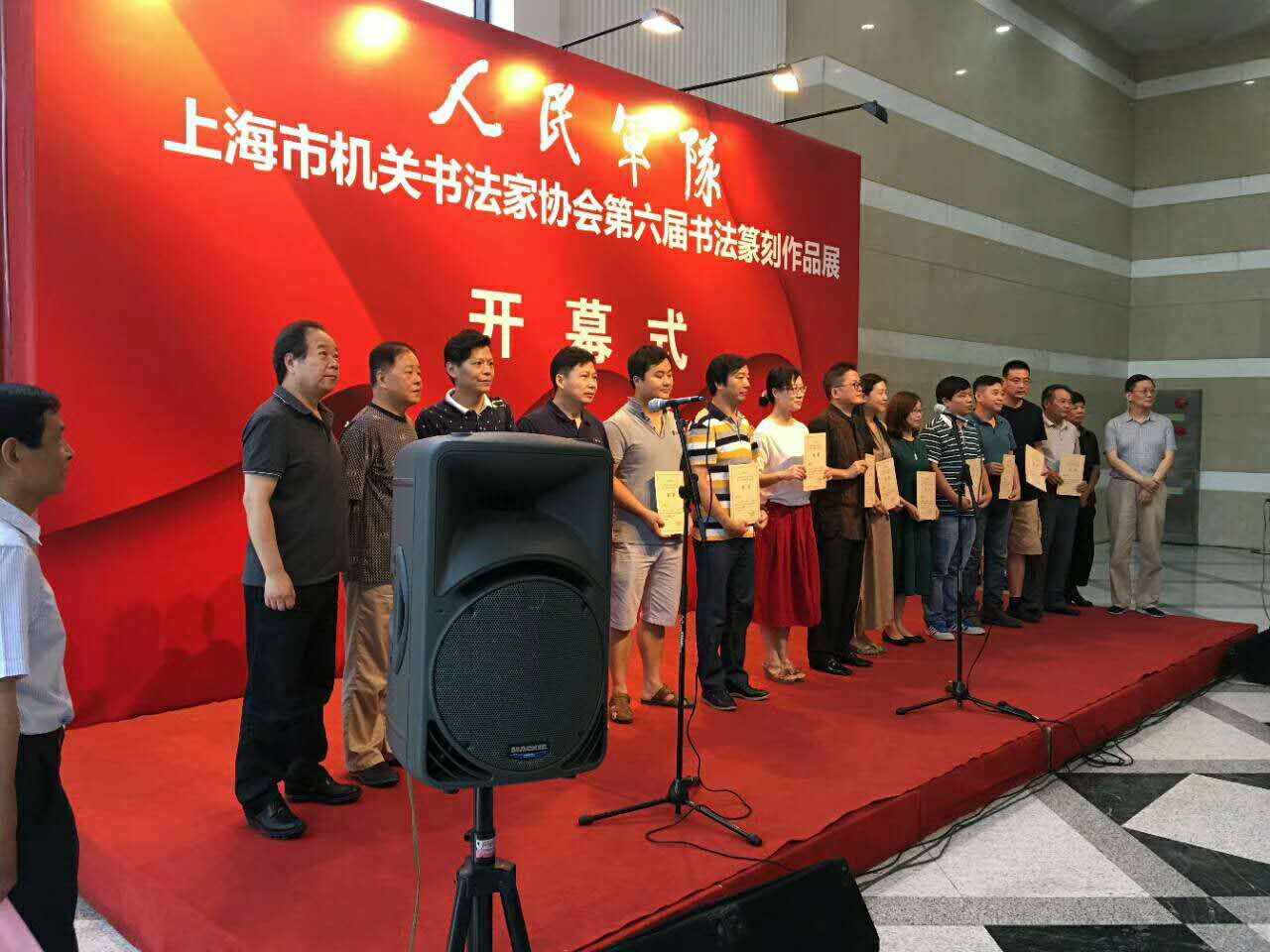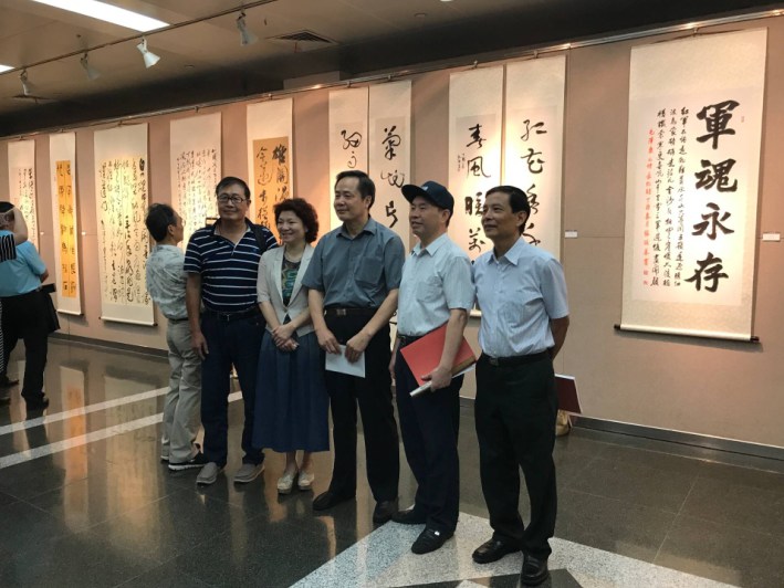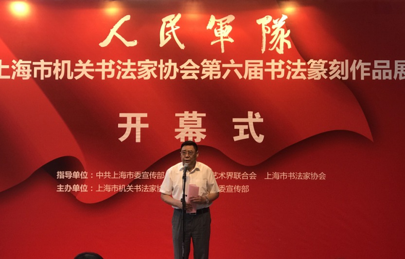 翰墨與軍魂,共筑強軍夢。由市機關書法家協會、中共虹口區委宣傳部共同主辦的人民軍隊——紀念中國人民解放軍建軍90周年書法纂刻作品展,于8月11日上午在上海圖書館隆重開幕。中共市委宣傳部副部長胡勁軍、市文聯專職副主席遲志剛、市國防教育基金會理事長劉健、市政協民宗委專職副主任徐梅、中共虹口區委宣傳部部長吳強、市書法家協會副主席徐正濂、張偉生、李靜、丁申陽、宣家鑫、徐慶華、王國賢、晁玉奎、副秘書長李俊、辦公室主任鄭振華市機關書協副主席吳申耀、張培基、副秘書長陳挺、江鵬及此次展覽的獲獎入展人員、書法愛好者200余人出席了展覽開幕式。
