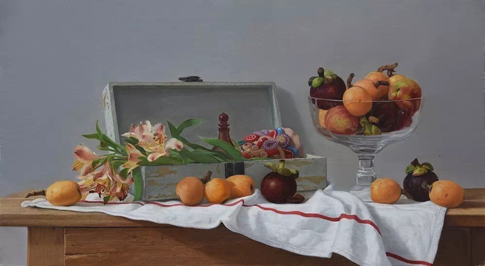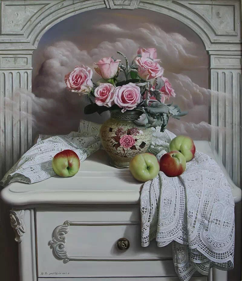 作品多以平凡生活為鋪墊,尤善物品之刻畫,在油畫領(lǐng)域中獨樹一幟。其造型沉穩(wěn)細(xì)膩,色彩典雅,描摹精致;其畫風(fēng)精美柔和,色調(diào)溫潤,不拘一格;其畫意清新自然,風(fēng)格獨特,極具藝術(shù)性和觀賞性。