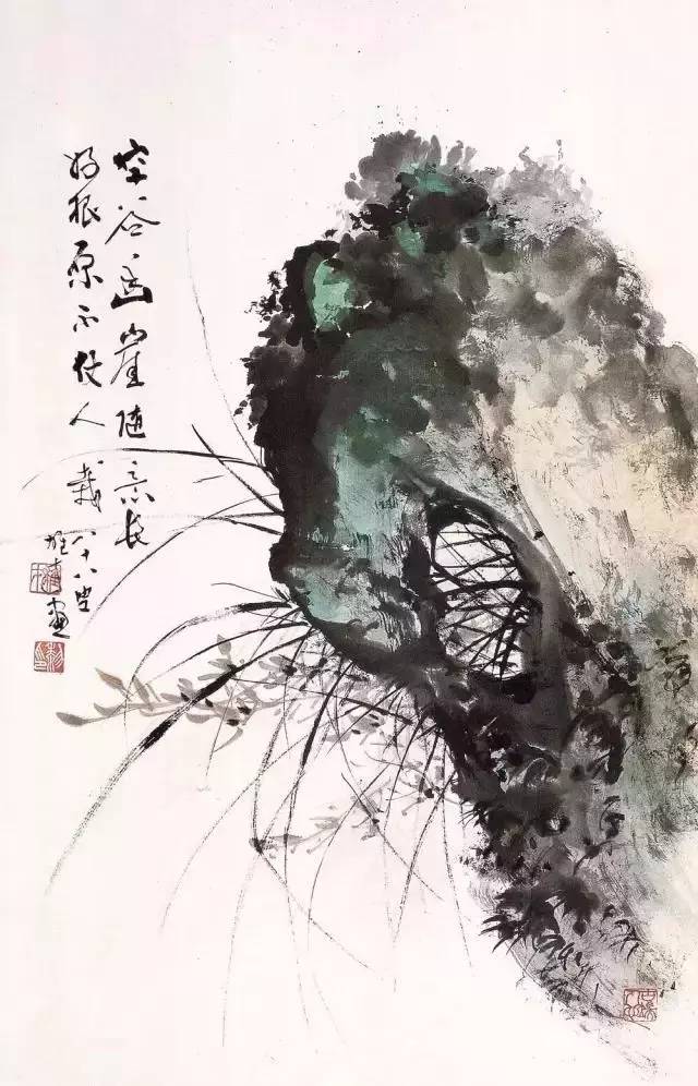 朱屺瞻畫蘭,線條樸拙老辣,尤其是濃墨干筆擦出的飛白線條,蒼蒼茫茫,耐人尋味。