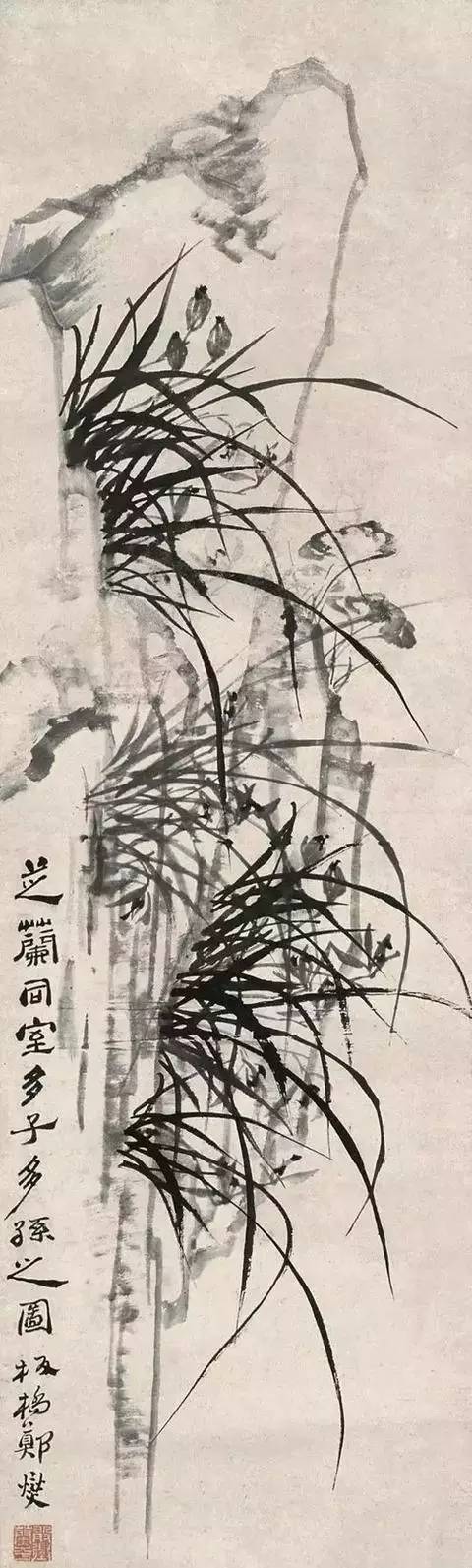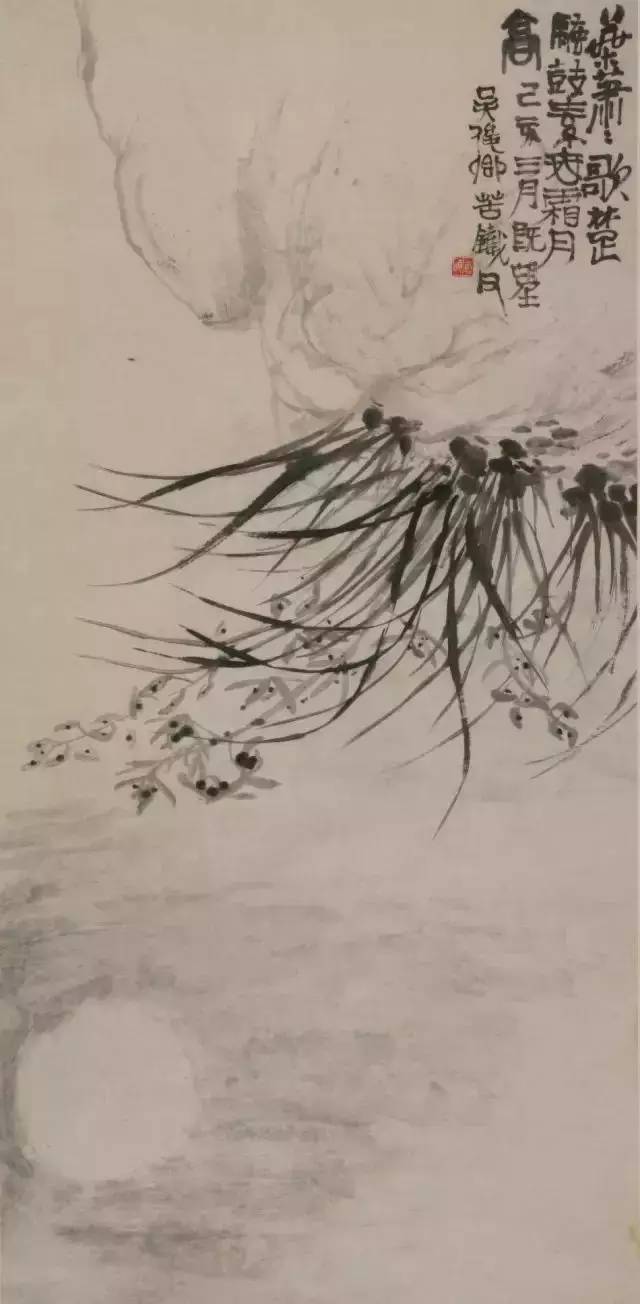 吳昌碩畫蘭,由于他書法、篆刻功底深厚,他把書法、篆刻的行筆、運刀及章法、體勢融入繪畫,喜以或濃或淡的墨色和用篆書筆法畫成,剛勁有力。