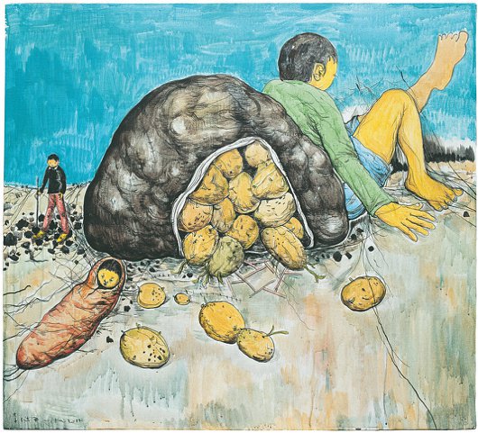 通過水性的丙烯顏料,李繼開作品中的詩性與感性展現(xiàn)的淋漓盡致。而本次展覽中所展出的《土豆》則是2014年,李繼開在荷蘭阿姆斯特爾芬“李繼開個展”上的重要作品。