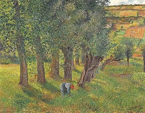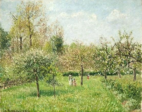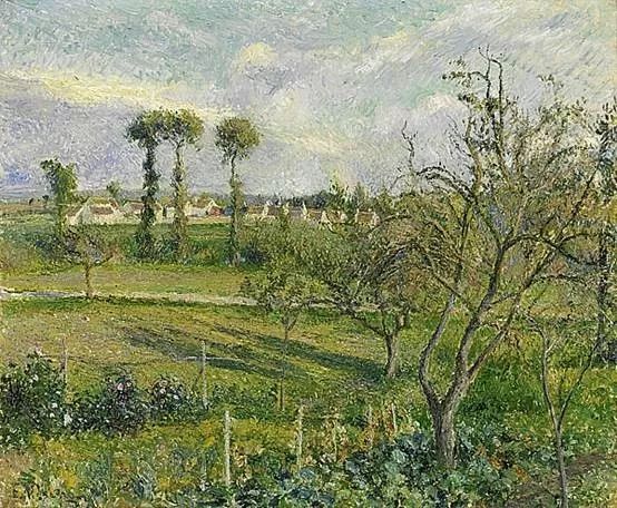 樹木的垂直效果,與田野的低矮,二者之間的對比關系,形成簡單的結構,把畢莎羅與其他印象派畫家的繪畫區別開來,使畢莎羅的繪畫具有一種寧靜、沉思感,而不再有"印象派"的緊張氣氛。