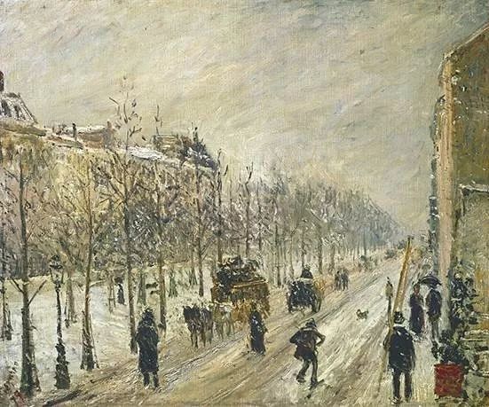 畫面中街道寬廣,行人與馬車都是速寫而成的,簡練、靈動,景物朦朧模糊、跳躍閃動,各種暖灰、冷灰、深灰、淺灰構成一幅格調高雅的城市風景。