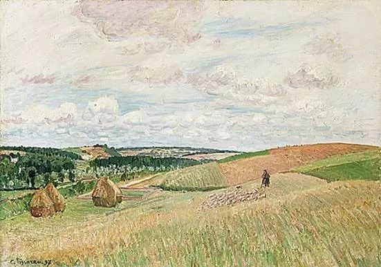 畫中看到的既有柯洛影子,但更多的是畢莎羅自己的清新的空氣、明媚的陽光、柔和深遠的云天,給人的時空和色彩的感覺妙極了,這種印象的真實感能喚起每個人如同身臨其境的回憶。
