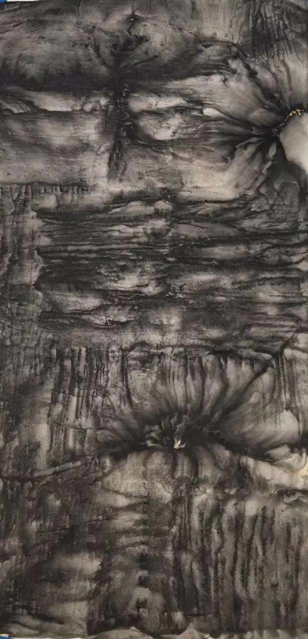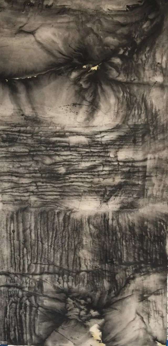 郭禎是來自美國的女藝術家,居住紐約幾十年了。她早年畢業于中國美術學院國畫系,八十年代國美是水墨實驗藝術的先鋒場地,郭禎和其他藝術家一起,都投入了這場風潮,之后“八五新潮”過去,移居西方,她骨子里的水墨情結卻未消失,而在一個大的中西方文化背景的比較下,她更意識到了作為一個中國人的文化選擇和本能表達,于是抽象水墨便成了她的選擇。在她的作品中,隨意暈染開來的墨跡,如同深淺不一的情緒,四泄而開,如同內心的隱秘地圖,千溝萬壑,起伏連綿,只有自己能走到。水和墨在交融那一刻產生的變化,充滿偶然性,這也是她尋求的效果。當觀眾在一種對水墨畫的慣性期待下突然看到這種沒有具體內容的畫面,思維模式受到了挫折,“看山不是山”,正是她追尋的哲學境界。