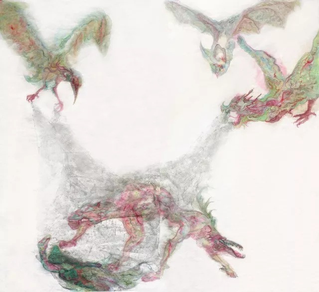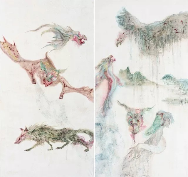 王艾茵畢業于中央美術學院國畫系,來云南工作已經十多年了,在她的作品中,精靈古怪的各種生物像夢魘一樣纏繞著人,它們有或明或暗的出處,有些來自古傳說《山海經》,有些來自歷代神話故事,有些純粹出于她自己的想象。這個日常中溫言細語的女子,用自己的畫筆創造了一個迴異于其它的瘋狂世界,在這個世界中,這些奇詭的生物無一不帶著殘酷的表情和鮮艷刺目的色彩,它們莫名其妙的存在也是她內心情緒的一種宣泄。而傳統花鳥畫的技法和表現內容也在她這兒有了新的闡釋。