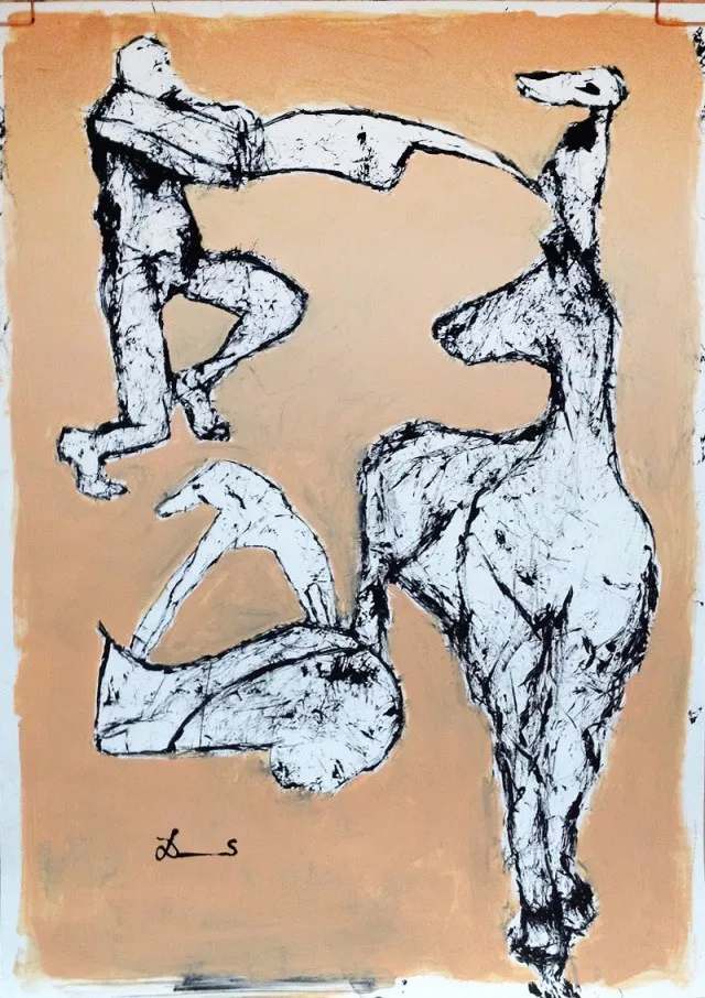 勒緹霞·杜香以前曾在巴黎大學攻讀過藝術史和攝影,然而多年以后,她卻發覺,硬材料雕塑和繪畫才是她的最愛。她喜愛用石頭打磨一個雕塑,或是用鐵片編織造型奇怪的形,這些形介于物體和生物之間,但是雕塑創作受條件限制很大,直到有一天,她用樹枝沾著墨汁開始在紙上作畫,立刻,一個新的世界就被打開了。她曾經和一個亞洲藝術家在一起生活過,東方文化令她著迷,東方人對紙張和墨的敏感也傳染了她,她用隨意采來的樹枝,蘸著墨汁在紙上塑造震顫的線條和形,然后又用類似古巖畫的顏色來限制這些形,于是畫面上便形成了個人性的圖像,它們充滿了現代的原始感,也有她個人的生命密碼。