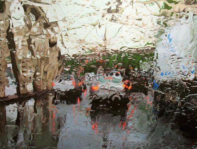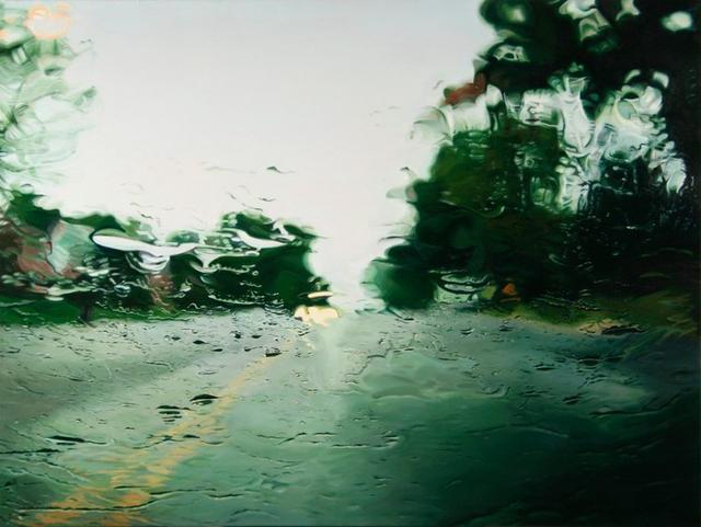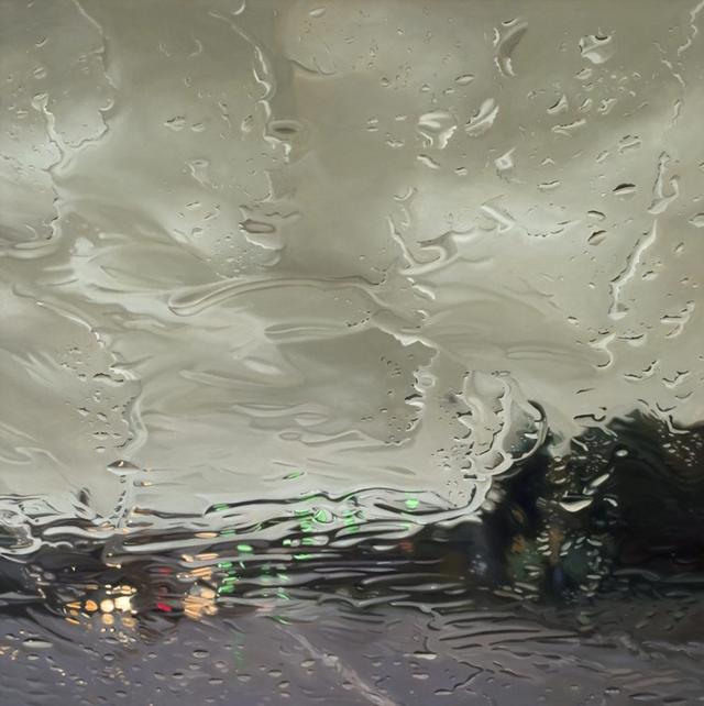 當代畫家Gregory Thielker的超級寫實主義油畫Under the Unminding Sky 《天空之下,漫無經心》,描繪了一系列車窗雨景。開著車,關閉刮雨器,穿越無數場暴雨,咔嚓咔嚓按下照相機快門。這些油畫就是他根據他所拍下的照片而畫的。
