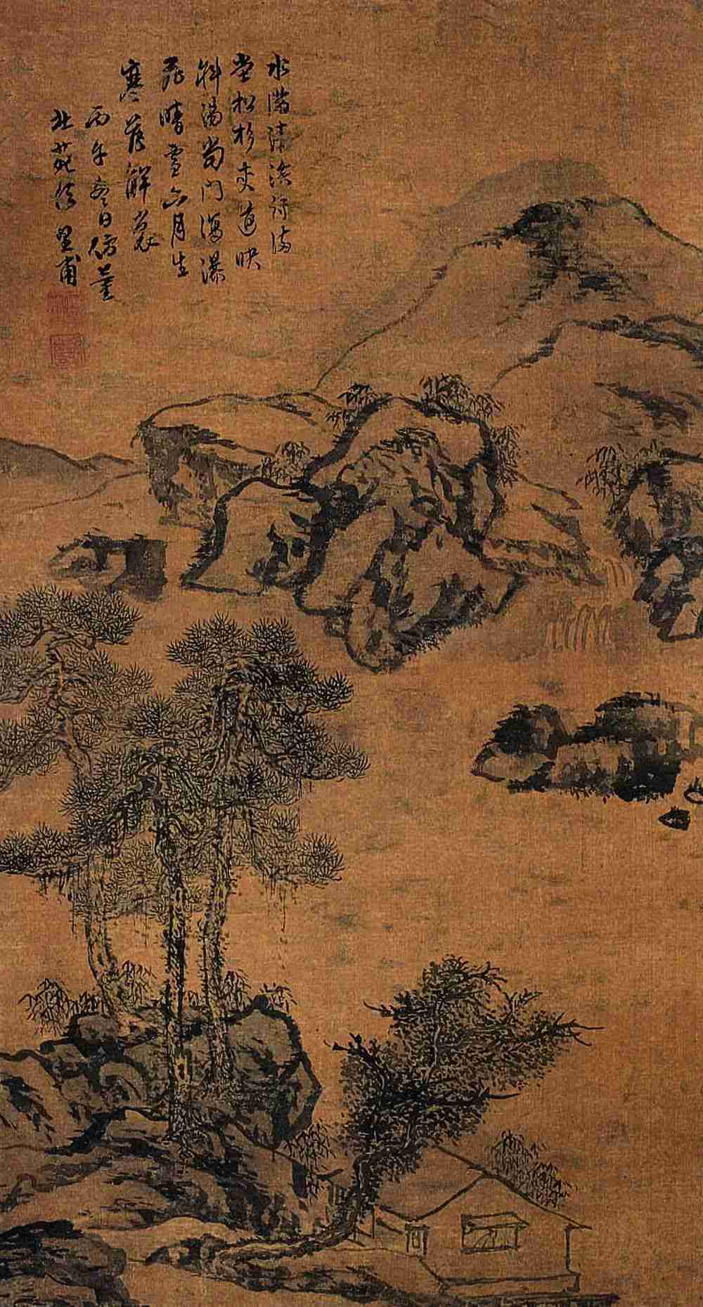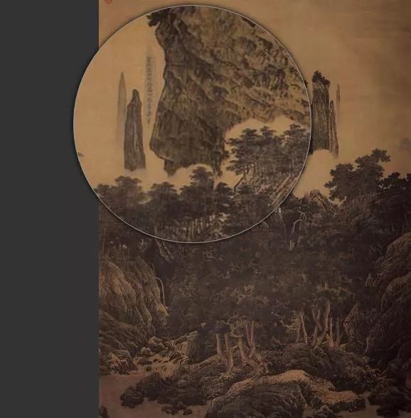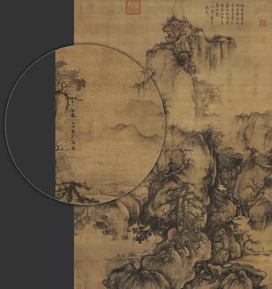 李唐,南宋畫家,字晞古。初以賣畫為生, 宋徽宗趙佶時入畫院。李唐《萬壑松風圖》隱款“皇宋宣和甲辰春,河陽李唐筆”于遠處山峰之中。