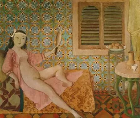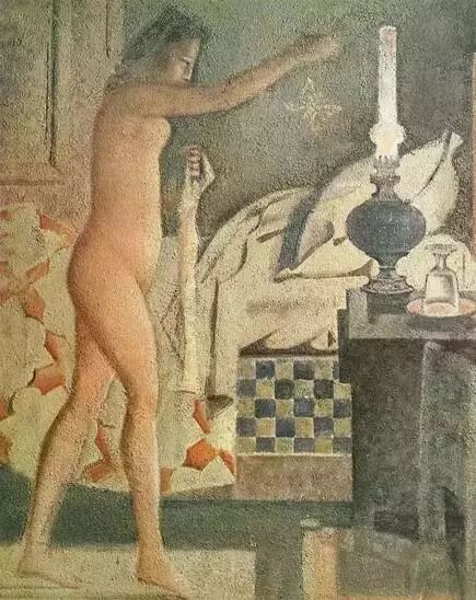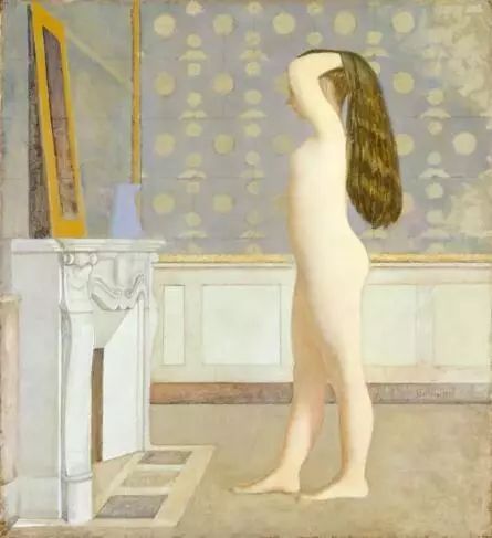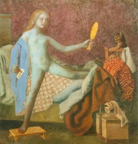 《壁爐前的少女》 Figure in Front of a Mantel 1955 藏于紐約曼徹波里坦藝術博物館比如這幅畫中描繪了以為壁爐前正對鏡子梳妝的少女,這里沒有任何欲念的困擾或罪惡的糾纏。
