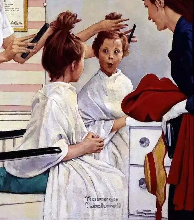 小妹妹的表情和理發師妖嬈的身段深深吸引著我,于是作者為了讓我把目光集中在小妹妹身上就無情地截去了后者,同時加上了一位母親。母親鮮亮的衣著又給整張畫面增添了童年的活潑氣氛。母親手中的衣服擠壓出一個紅唇的形狀,不知是不是畫家在作品中埋下的深層的意象呢?