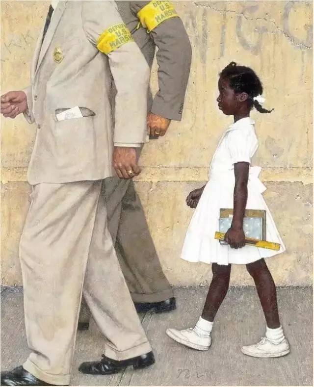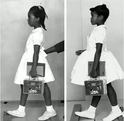這個小女孩比原來多了一個青腫的眼窩,在畫面的后方又多了一對似乎正在議論著她的男士,而女孩的和做著的男士的眼神又好像望著畫面中看不到的第四個人。