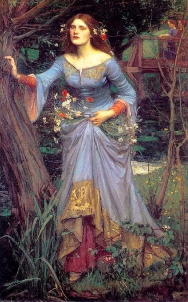 奧菲莉亞是莎士比亞創作的著名悲劇《哈姆雷特》中的一個人物,她躺在河岸草場上,眼神瘋狂而絕望,一只手握著亂發,另一只手抓著一束花。