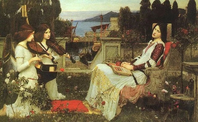 圣賽西莉婭生活在約公元前230年,她因發誓終身信仰基督教并保持貞節而聞名。圣賽西莉婭節是11月22日。沃特豪斯嘗試用本圖傳達某種中世紀的感覺,而他也的確做到了。富有裝飾性的畫面,還有一點宗教畫的味道。幾乎沒有現實主義和日常生活的痕跡。