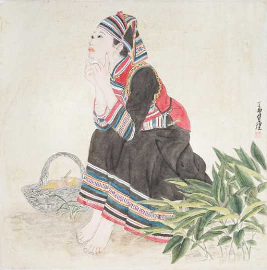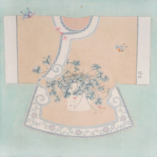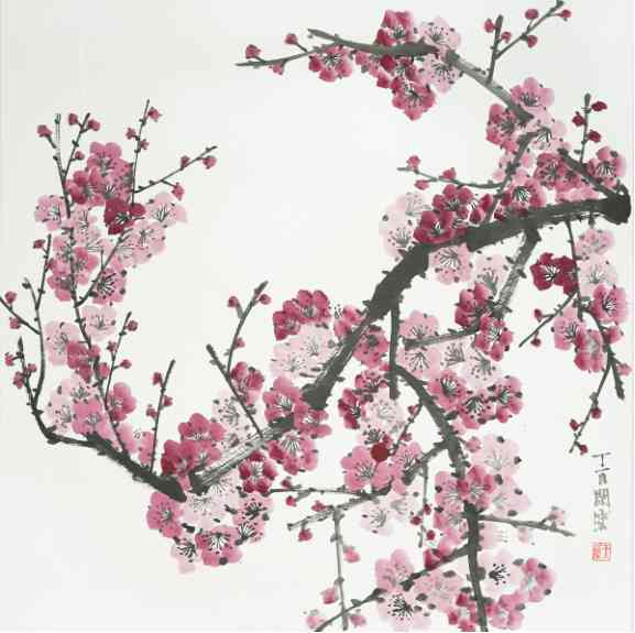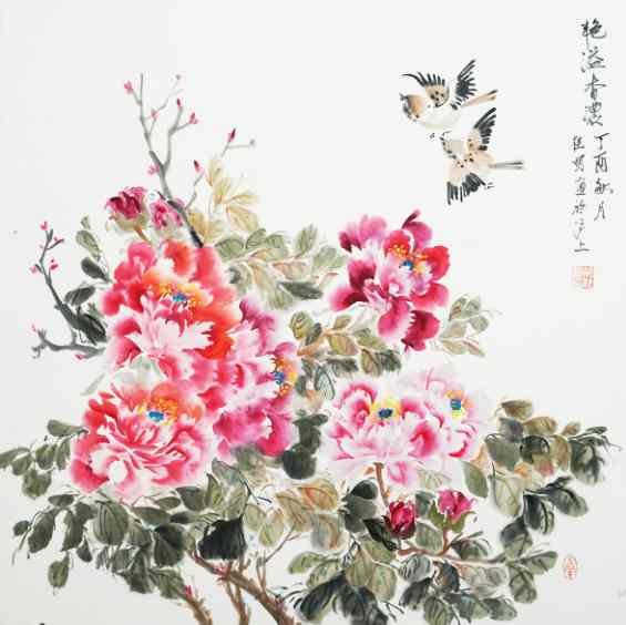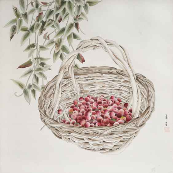 菊萍芳《葉綠桃紅》國畫 65×65cm