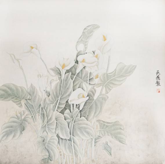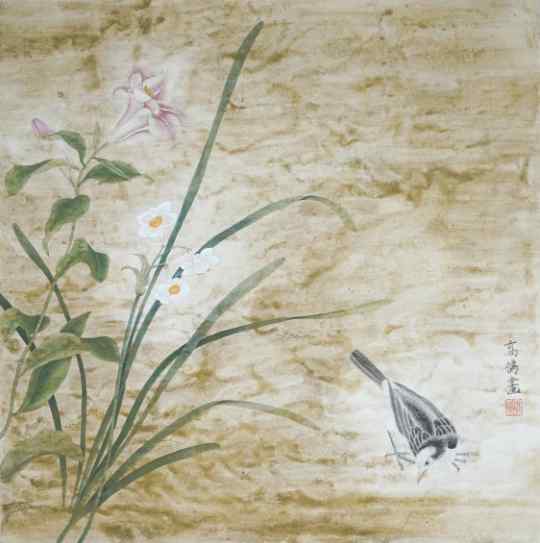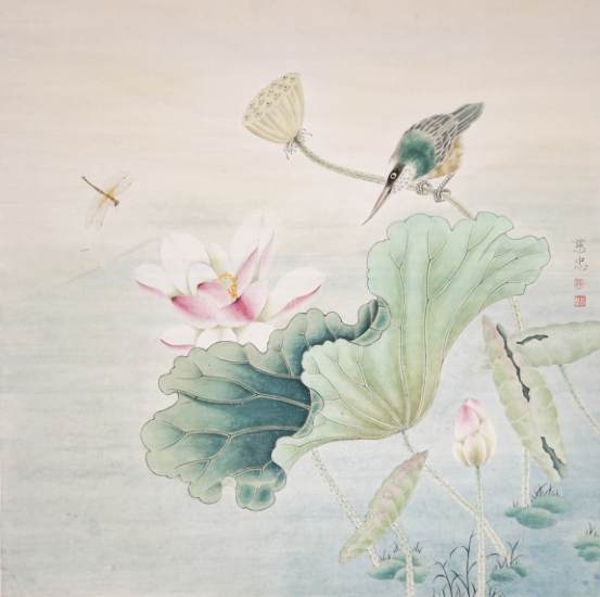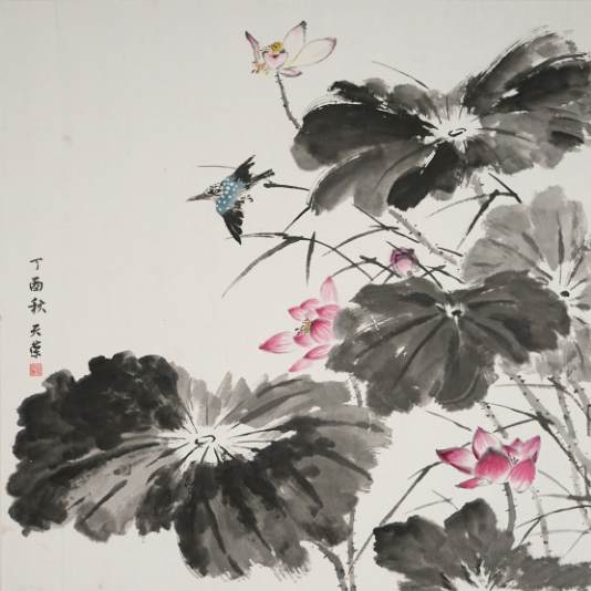 張天榮《荷花小鳥圖》國畫 68×68cm