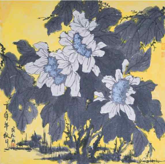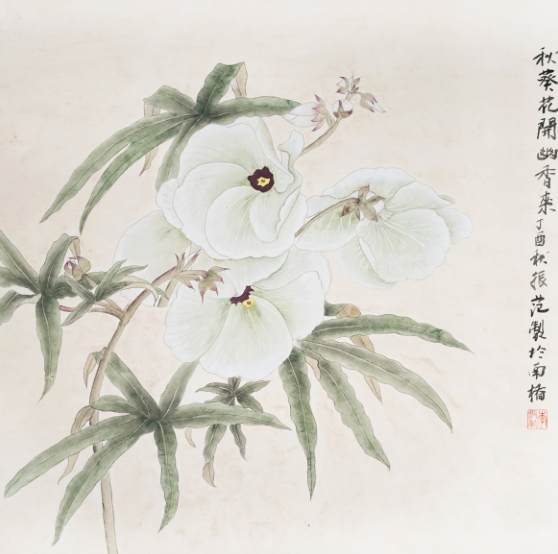 李振范《秋葵花開幽香來》國畫 65×65cm