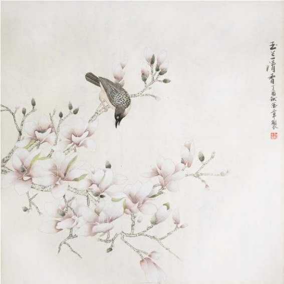 張慈鐘《荷花小鳥圖》國畫 68×68cm