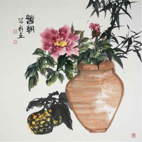 陶迎新《牡丹竹桔圖》國畫 68×68cm