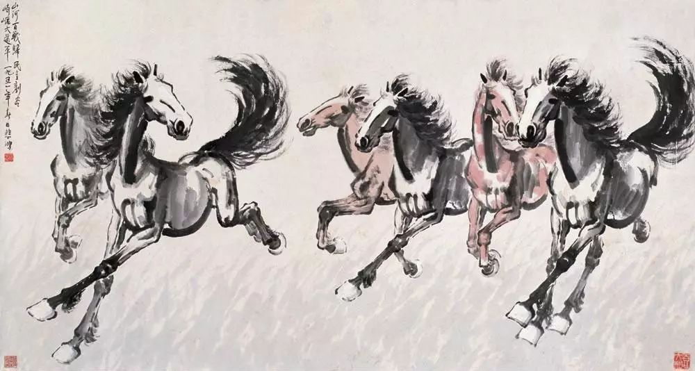 “情之所至,金石為開”,正是如此。畫家情之所鐘,動人的藝術品質自然流出,情景交融,意趣橫生。比如徐悲鴻的《奔馬》,具有一種勇往直前的英雄氣概。齊白石的《蝦》,則躍動著蓬勃的生機。而潘天壽的《山花》,像山姑般純樸而俊美。社會生活和大自然的大干世界,以藝術家的眼睛,會發現許多美好的東西,行諸筆墨,以其豐富的藝術美,美化生活,美化人們的心靈。